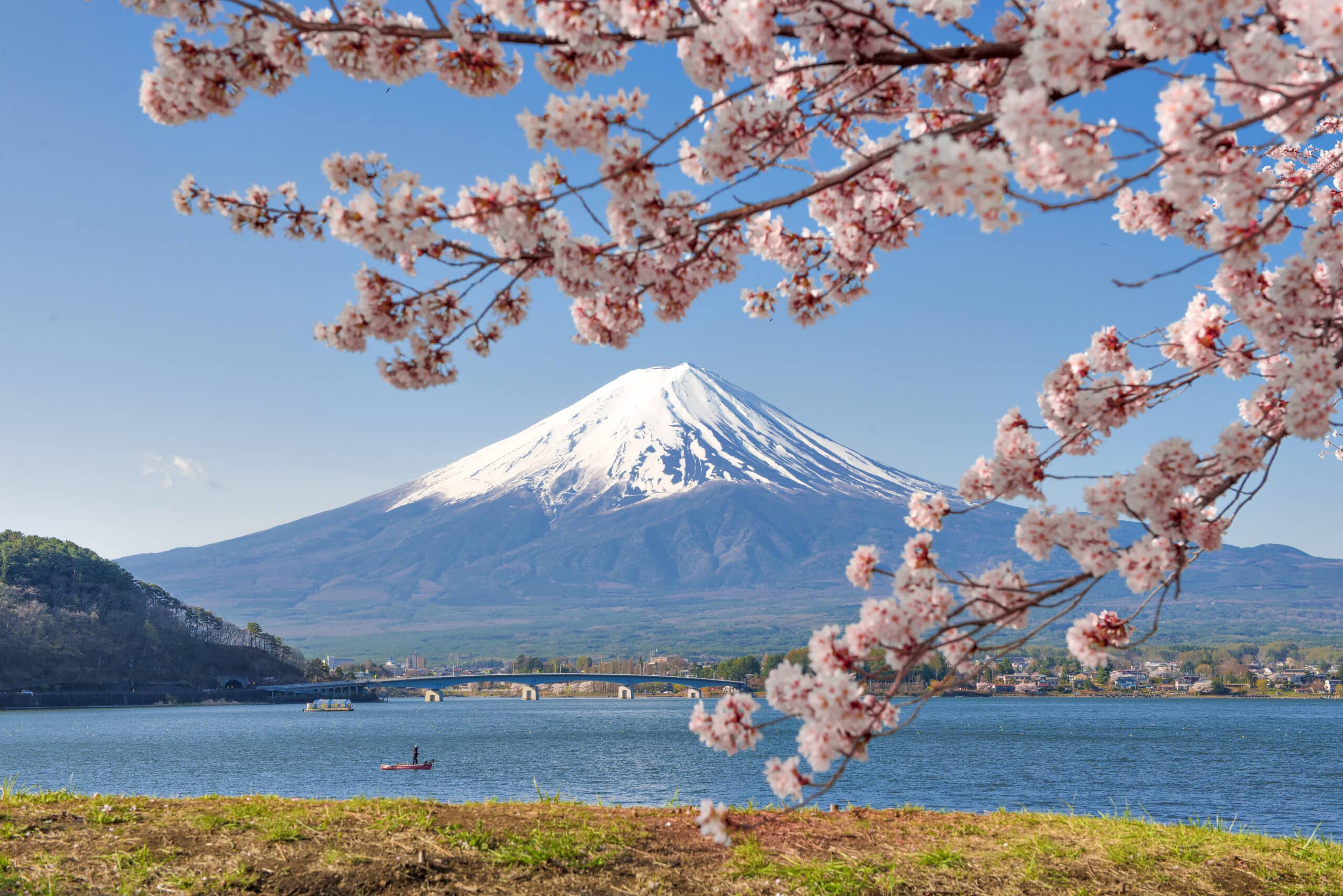 Fuji Mountain and Pink Sakura Branches at Kawaguchiko Lake