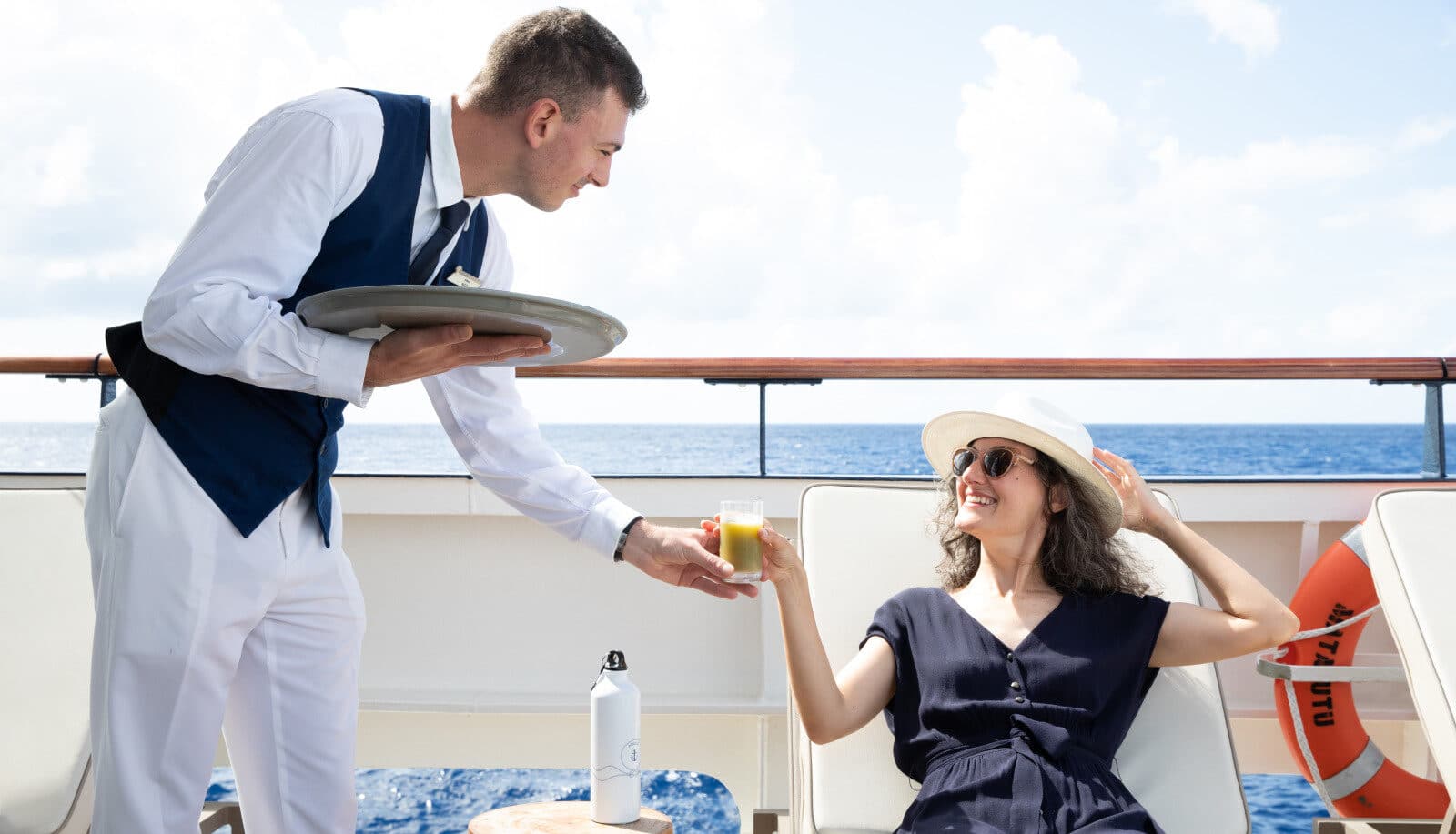 Ponant is the world’s only French cruise line, and onboard, the “French touch” is everywhere, starting with the language. All of the crew are bilingual in French and English, but French is the main language spoken on board no matter your destination. All signage and announcements made are in French and English, but you may want to brush up on some French phrases before you cruise.