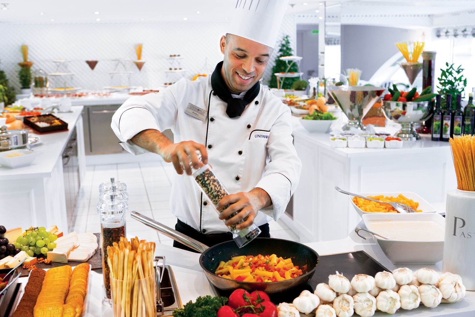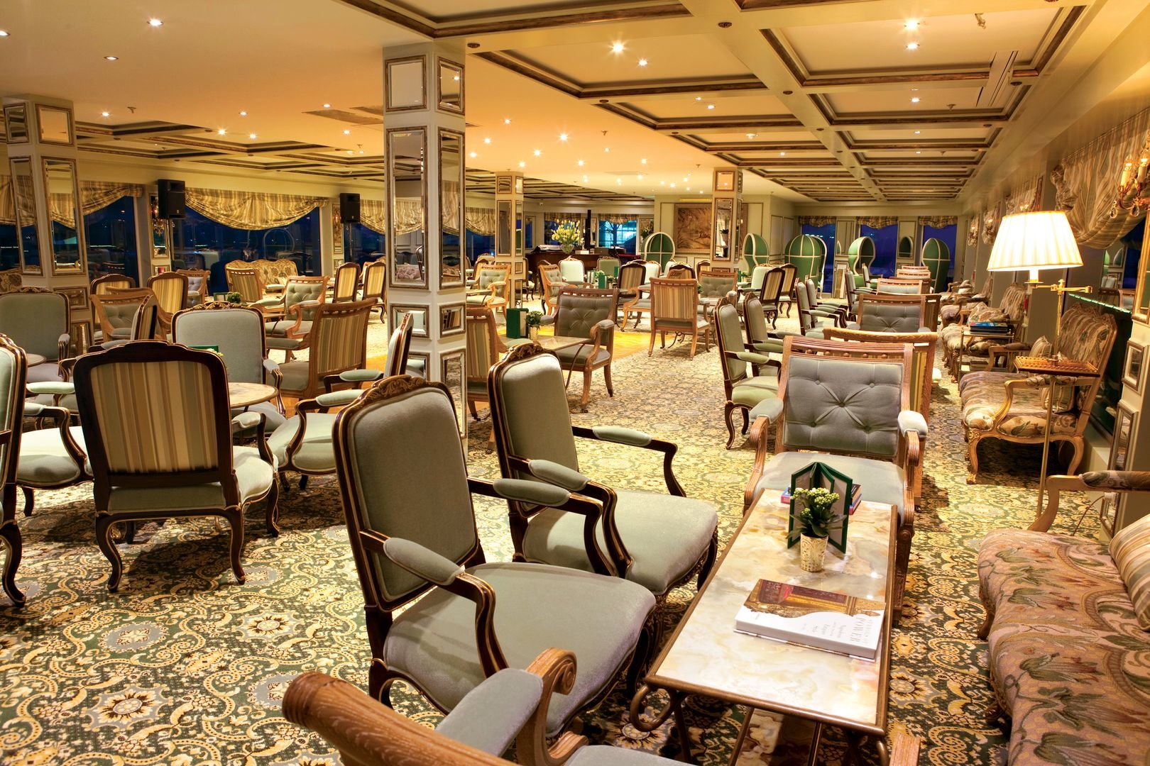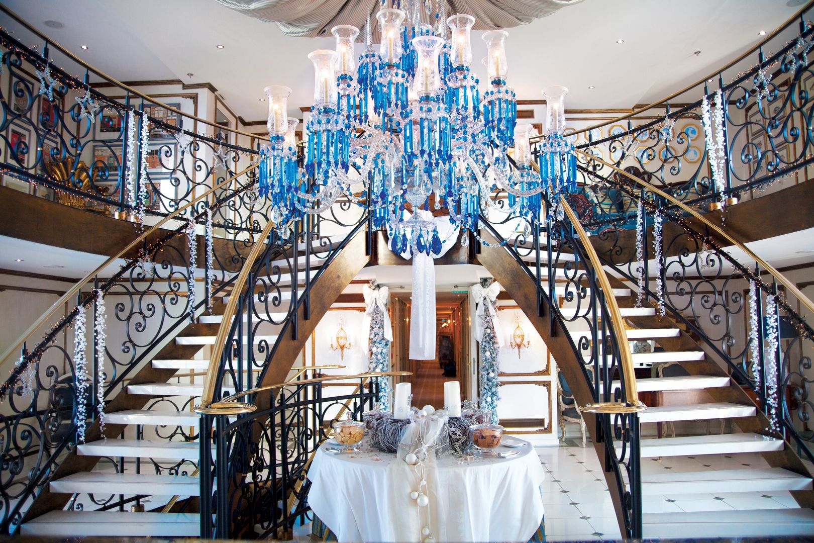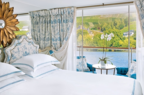 The luxurious décor of the 443-foot, 152-passenger S.S. Antoinette—Uniworld’s first Super Ship—features fine Brazilian marble on the walls and floors, a 19th-century Venetian glass mirror, a stylish Bar du Leopard with full-service bar, and an onboard cinema. The two-story foyer boasts a 10-foot blue Strauss Baccarat chandelier with huge sapphires—a stunning piece that once hung in New York’s famous Tavern on the Green—and a collection of original artwork is displayed throughout the ship.