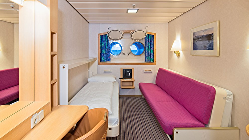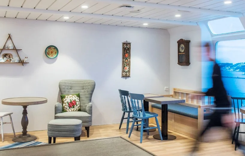 The vessel also has a large compass area were you find the reception, the Coastal Experience Team, conference room and shop. The top deck of the boat features a sun deck, observation saloon and panorama lounge, all of which provide splendid views of spectacular coastal scenery.