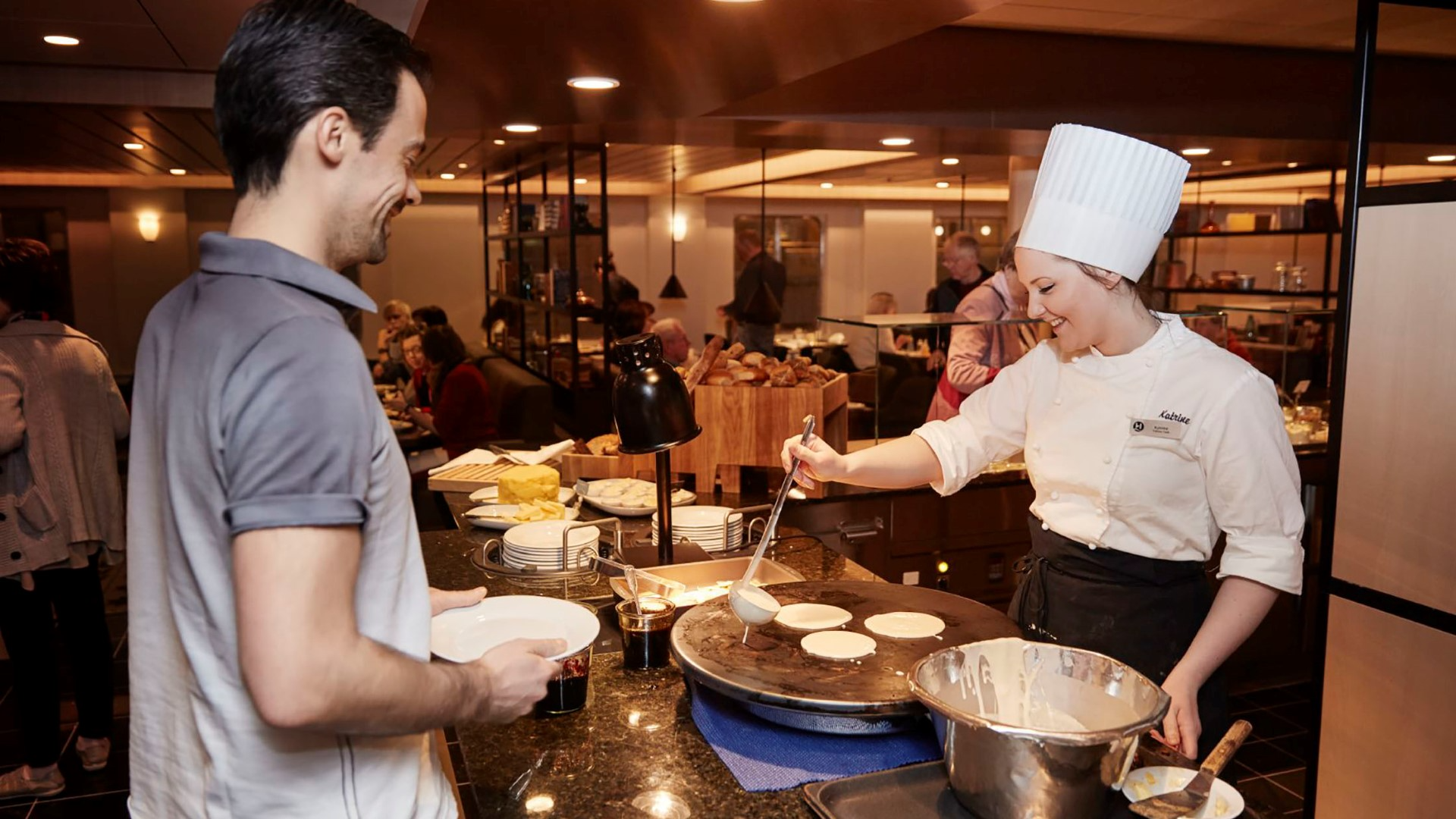 MS Kong Harald was refurbished in 2016 and now features a modern, Arctic-inspired interior. On board are three different restaurants, the Multe bakery and ice cream bar, a sauna and fitness room. Out on deck you can enjoy the view from one of our two hot tubs. There is a comfortable bar at the front of the ship where you can enjoy a nice traditional drink.