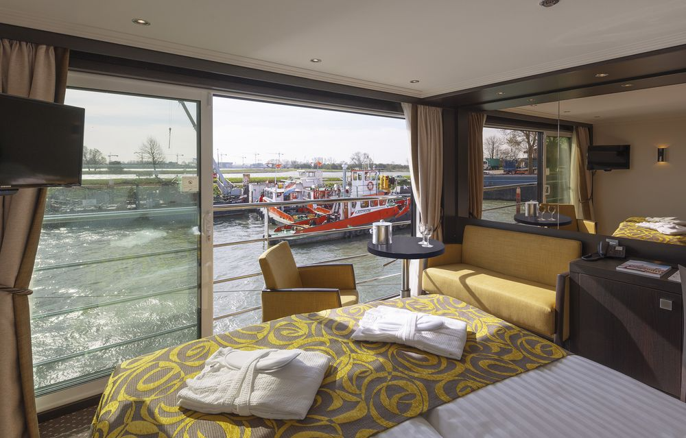Part of Avalon’s cutting-edge fleet of Suite Ships, the Avalon Impression came onto the river cruising scene with a bang. This gorgeous ship features two full decks of Panorama SuitesSM with Wall-to-Wall Panoramic Windows that transform the living space into a unique Open-Air BalconySM. With 200 square feet, Panorama SuitesSM are more than 30% larger than the industry standard, affording you the incomparable opportunity to wake each morning facing the splendid passing scenery. Onboard amenities include an alternative light dining option in the Panorama Bistro, a Fitness Center, complimentary Wi-Fi access, and a spacious Sky Deck with premium lounge chairs, whirlpool, and light al fresco lunches at the Sky Bistro on the Sky Deck.