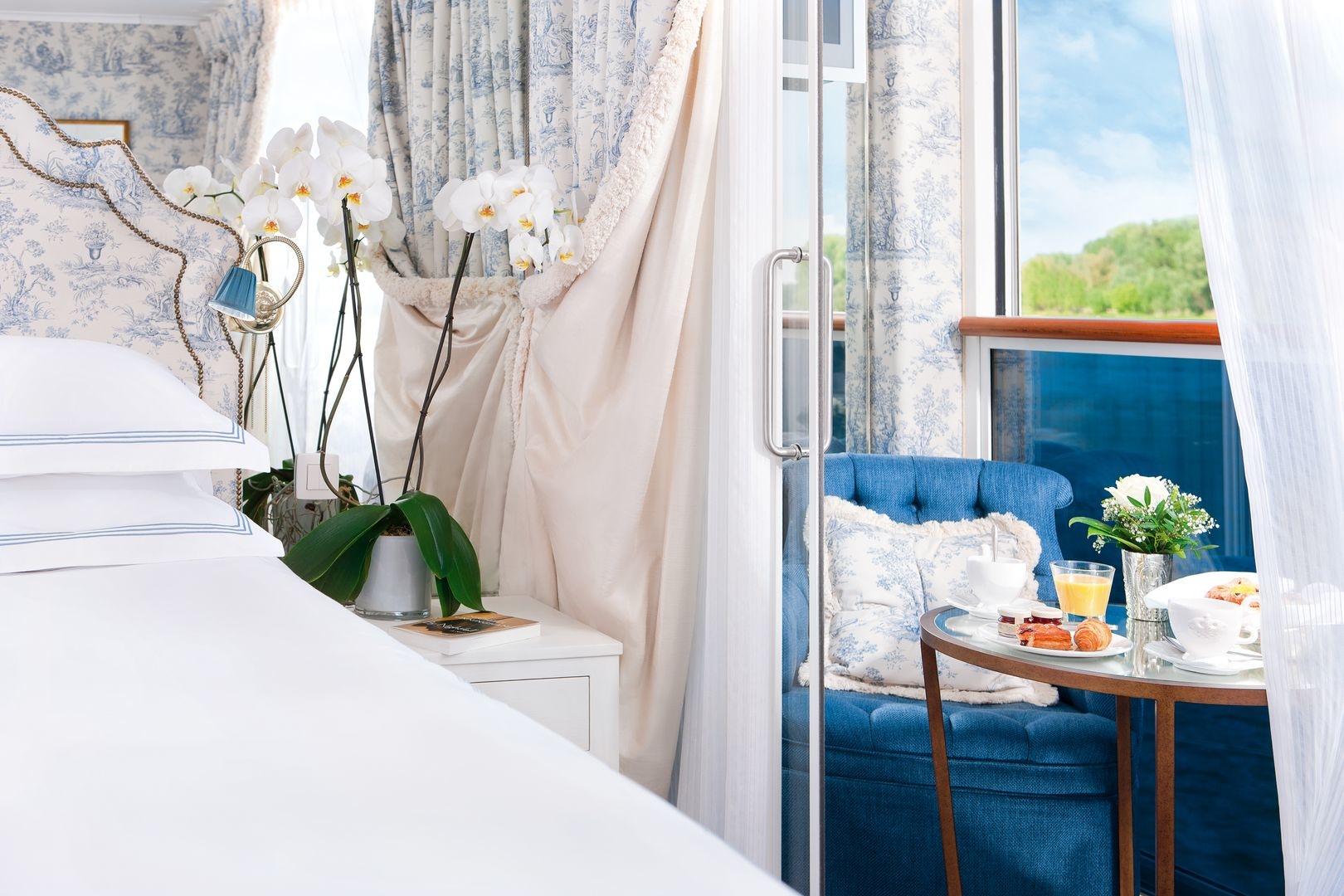 The luxurious décor of the 443-foot, 152-passenger S.S. Antoinette—Uniworld’s first Super Ship—features fine Brazilian marble on the walls and floors, a 19th-century Venetian glass mirror, a stylish Bar du Leopard with full-service bar, and an onboard cinema. The two-story foyer boasts a 10-foot blue Strauss Baccarat chandelier with huge sapphires—a stunning piece that once hung in New York’s famous Tavern on the Green—and a collection of original artwork is displayed throughout the ship.