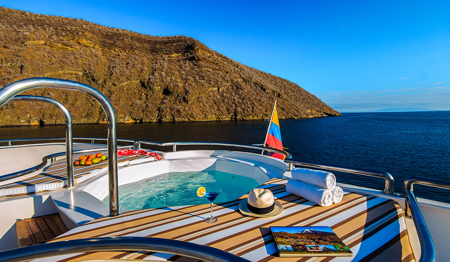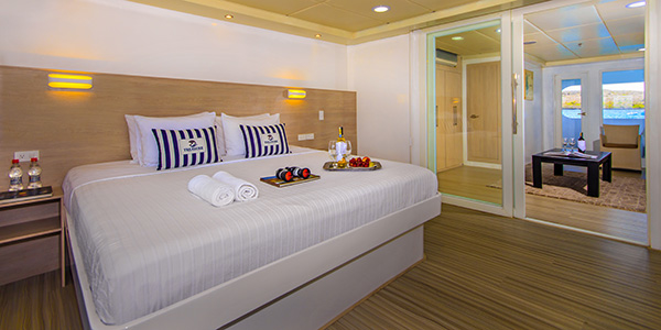 Seeing the Galápagos Islands on board the 9-suite Treasure of Galápagos goes beyond traditional cruising and allows you a truly intimate experience with a maximum of 16 guests. Chartered exclusively for Avalon guests, the Treasure of Galápagos features spacious suites with balconies and takes you around the archipelago to explore the natural wonders of the region in privacy and comfort. Completely refurbished in October 2017, the Treasure of Galápagos is built to luxurious standards and features an elegant yet relaxed atmosphere, allowing guests to enjoy all that the Galápagos is famous for intimate contact with the wildlife! Delve into this unique world with the Treasure of Galápagos’ crew and expert Naturalist, who shares their passion for nature and conservation of this mysterious part of the world. The Treasure of Galápagos’ non-smoking interior features elegantly appointed common areas including an indoor lounge & bar, dining area, shaded outdoor lounge, sun deck with Jacuzzi, and an observation area for whale or dolphin watching. Each of the seven outside suites offers a private balcony, which is rare in the Galápagos, air-conditioning, private bathroom, hairdryer, and safe. In addition, the 430 square-foot Master Suite boasts two private balconies as well as a private living area.